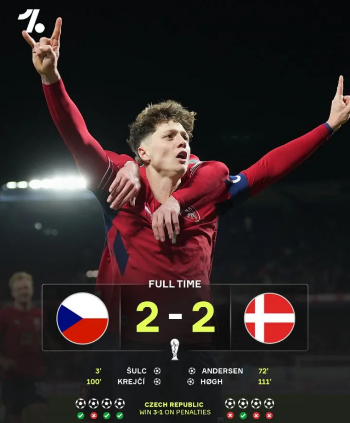捷克 1-1 丹麦,点球3-1淘汰丹麦!