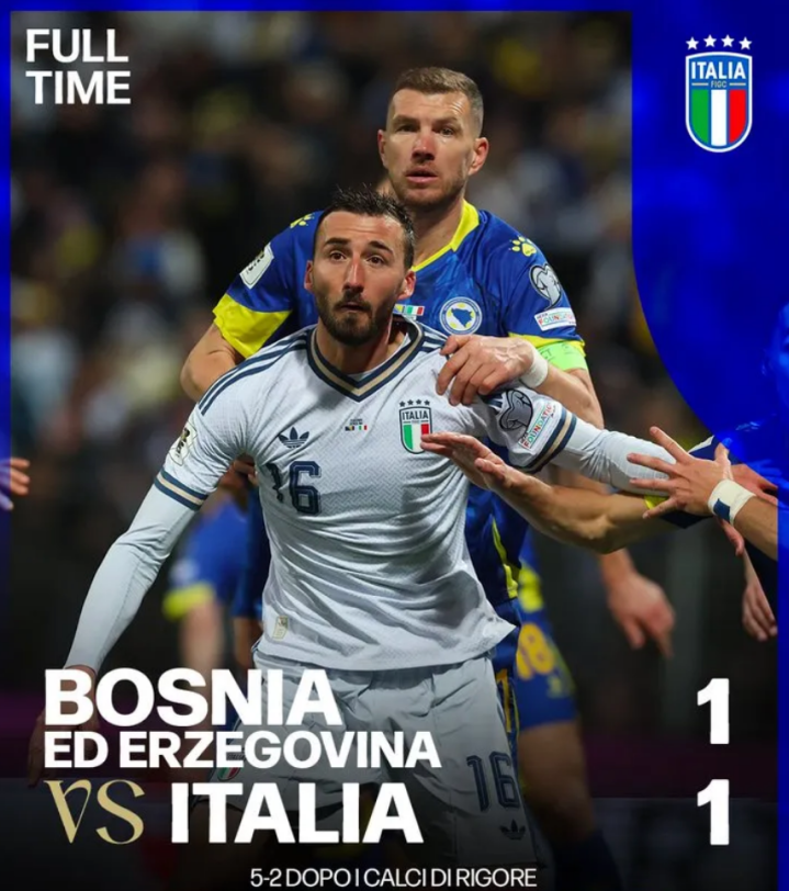 值得一提的是,这是波黑时隔12年第二次闯入世界杯,对于40岁的哲科、36岁的皮亚尼奇等老将来说,终于在职业生涯尾声圆梦。四星意大利则连续三届倒在世界杯附加赛决赛,2018年世界杯附加赛两回合遭瑞典淘汰,2022年世界杯附加赛被北马其顿淘汰,2026年不敌波黑,意大利成为世界杯历史上首支连续三届无缘决赛圈的冠军球队。