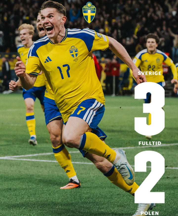世预赛欧洲区附加赛B组决赛,瑞典坐镇主场友谊竞技场迎战波兰。上半场第19分钟,伊兰加帮助瑞典先拔头筹,波兰则凭借扎莱夫斯基第33分钟的进球扳平比分;上半场尾声阶段,瑞典依靠拉格比尔克的进球再次反超,第55分钟希维德尔斯基破门,波兰再次顽强扳平比分;第88分钟,约克雷斯上演绝杀,最终瑞典3-2击败波兰晋级世界杯,将进入世界杯F组,与荷兰、日本和突尼斯同组。